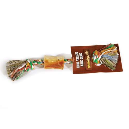 Ranch Rewards Combo Dog Chew, Natural Bone, 14-1/2-Inch. Ranch rewards natural bone combo chew is combination rope toys and chew treats for dogs. Strong cotton rope toys are strung with bones or hooves to give dogs an extra long lasting chew. The rope cleans teeth, flosses and massages gums. Bones and hooves help to reduce plaque and tartar as dog chews. Rope colors may vary. Do not allow your dog to chew torn pieces. Such pieces may be considered a choking hazard. Supervision of your pet is advised. This product may stain certain fabrics or surfaces. Measures 14-1/2-inch length.